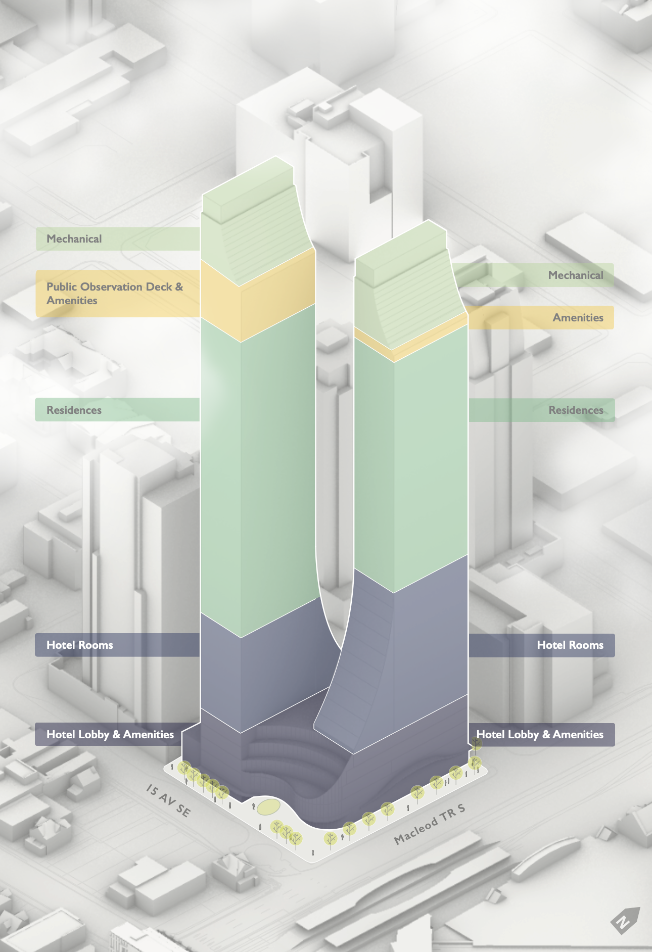 To enable this, density bonusing mechanisms are proposed within a custom Direct Control (DC) District based on the CC-X District. Truman is proposing a variety of bonusing strategies, including Indoor Public Hotel Space, an Innovative Public Amenity delivered through a publicly accessible observation deck and restaurant at the top of one of the W Tower, on-site Public Art, Exceptional Design, contributions to the Beltline Community Investment Fund or Affordable Housing Fund, and FAR exclusions for three-bedroom units. The final suite of applicable density bonding mechanisms will be confirmed through the concurrent Development Permit review.