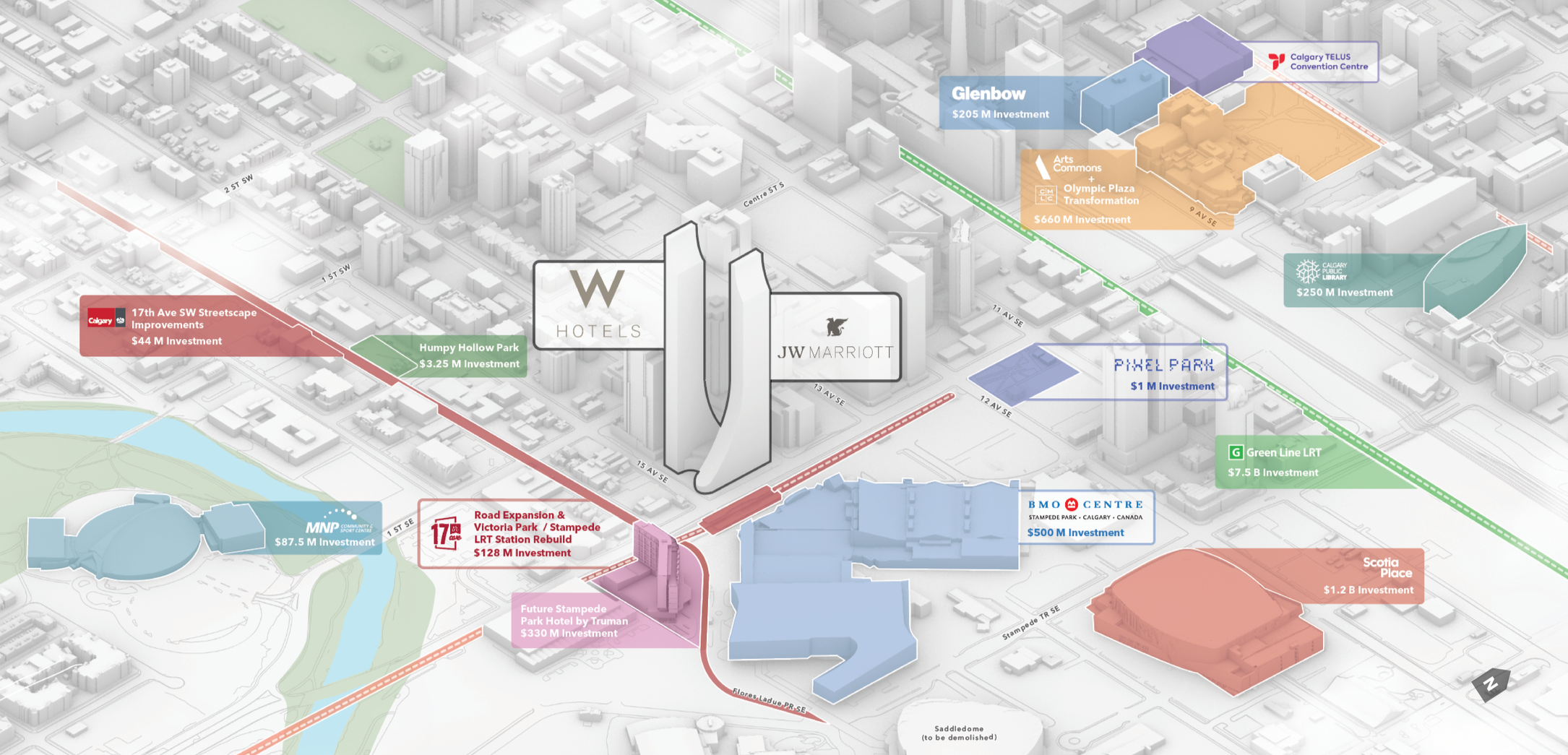 The W and JW Marriott Hotels & Residences are part of Calgary’s rapidly developing Culture + Entertainment District. The District hosts a number of recently completed, under construction, and soon-to-be constructed city-building projects representing billions of dollars in public investment.